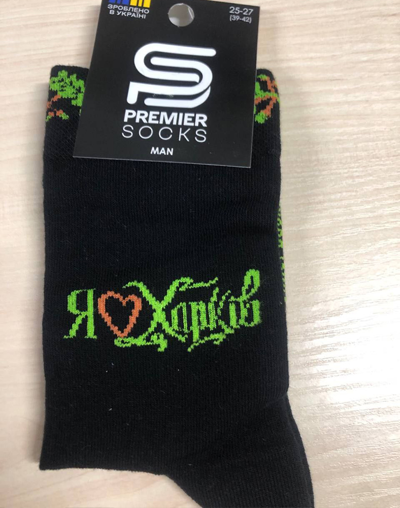 Стильные мужские носки с яркой тематической надписью — отличный способ добавить индивидуальности в повседневный образ. Чёрная основа выглядит универсально, а контрастный зелёно-оранжевый принт с надписью «Я ❤️ Харьков» создаёт выразительный акцент.