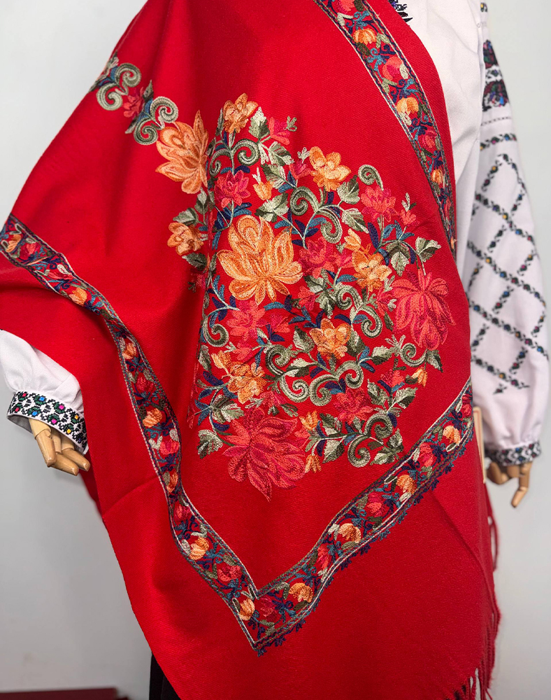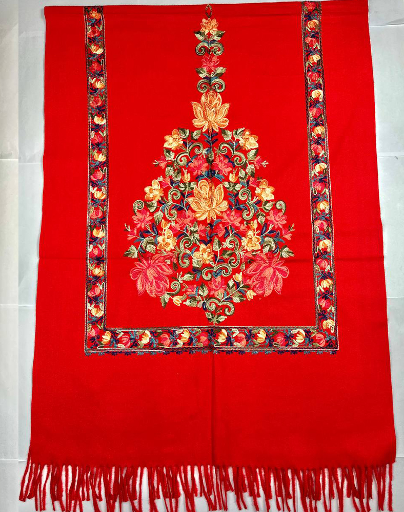 Яркий красный кашемировый палантин с вышивкой — символ энергии, стиля и утончённости. На мягком полотне из 100% кашемира размещён роскошный цветочный орнамент в золотистых, зелёных и синих оттенках, обрамлённый декоративной рамкой. Такое изделие выглядит празднично и элегантно одновременно, идеально подходя как для повседневного использования, так и для особых случаев.