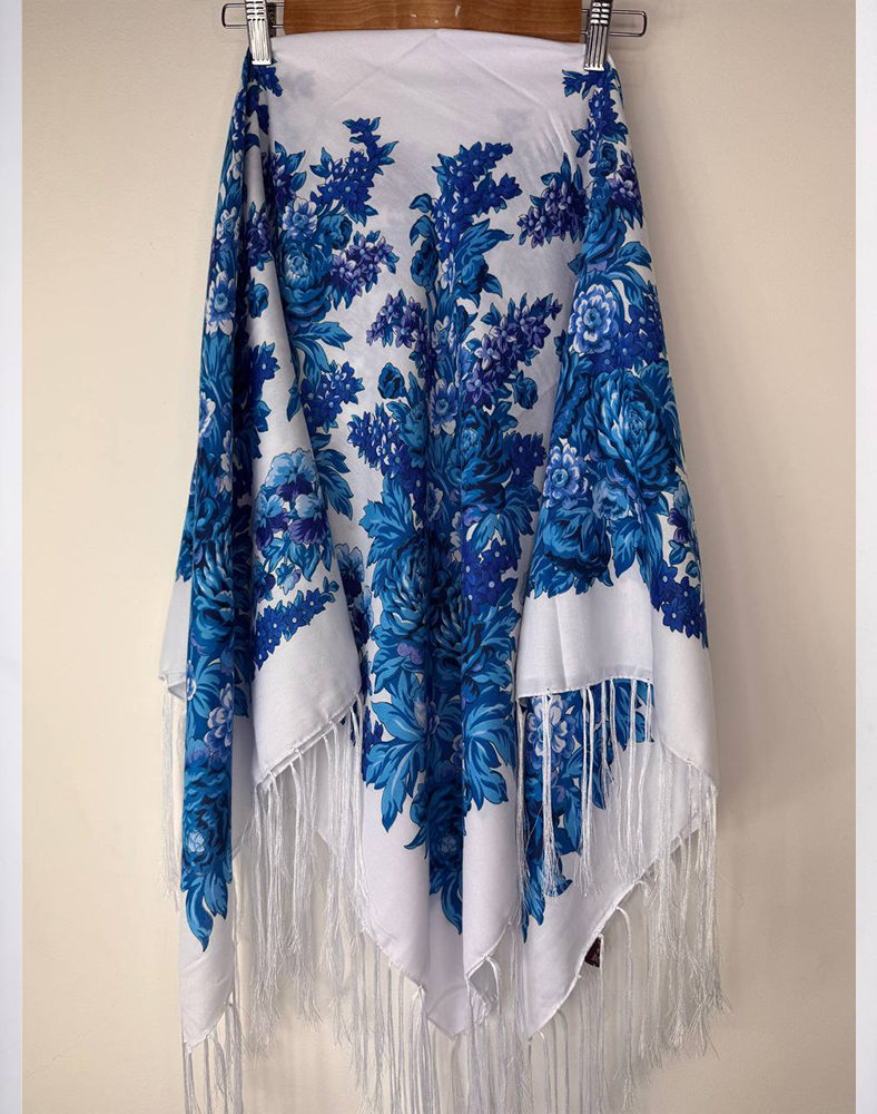 Стильный украинский платок с цветочным орнаментом в благородной голубо-белой палитре. Крупные цветы в насыщенных синих тонах формируют чистый, выразительный и по-настоящему праздничный этнический образ. Модель прекрасно дополняет светлые пальто, пуховики и вышиванки.