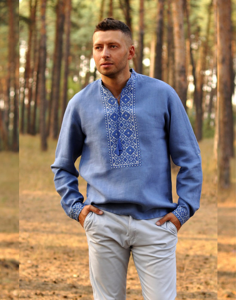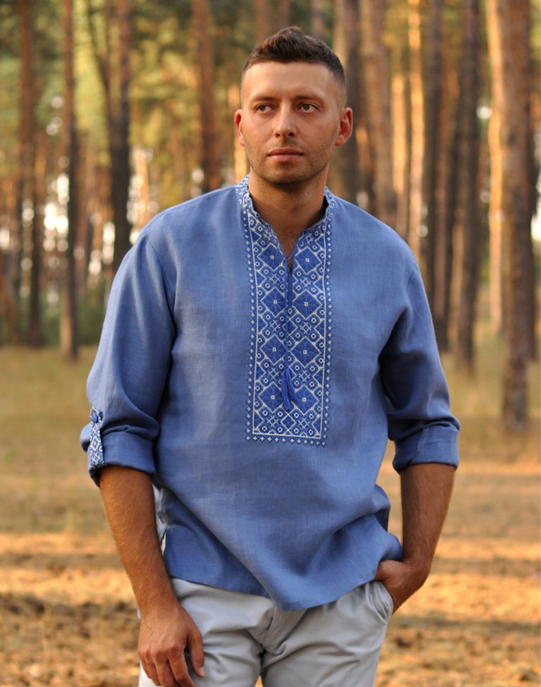 Вышитая мужская рубашка со стойкой и длинным рукавом.