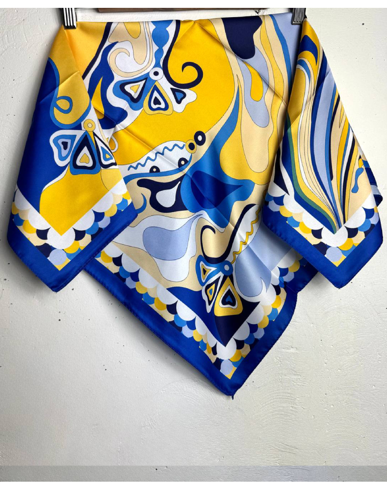 Украинский патриотический платок в ярких сине-жёлтых цветах — это стильный и выразительный аксессуар, который сочетает национальное настроение, современный дизайн и праздничную эстетику. Насыщенные оттенки синего и жёлтого гармонично переплетаются с мягкими светлыми линиями и декоративными элементами, образуя оригинальный абстрактный узор с динамичным характером.