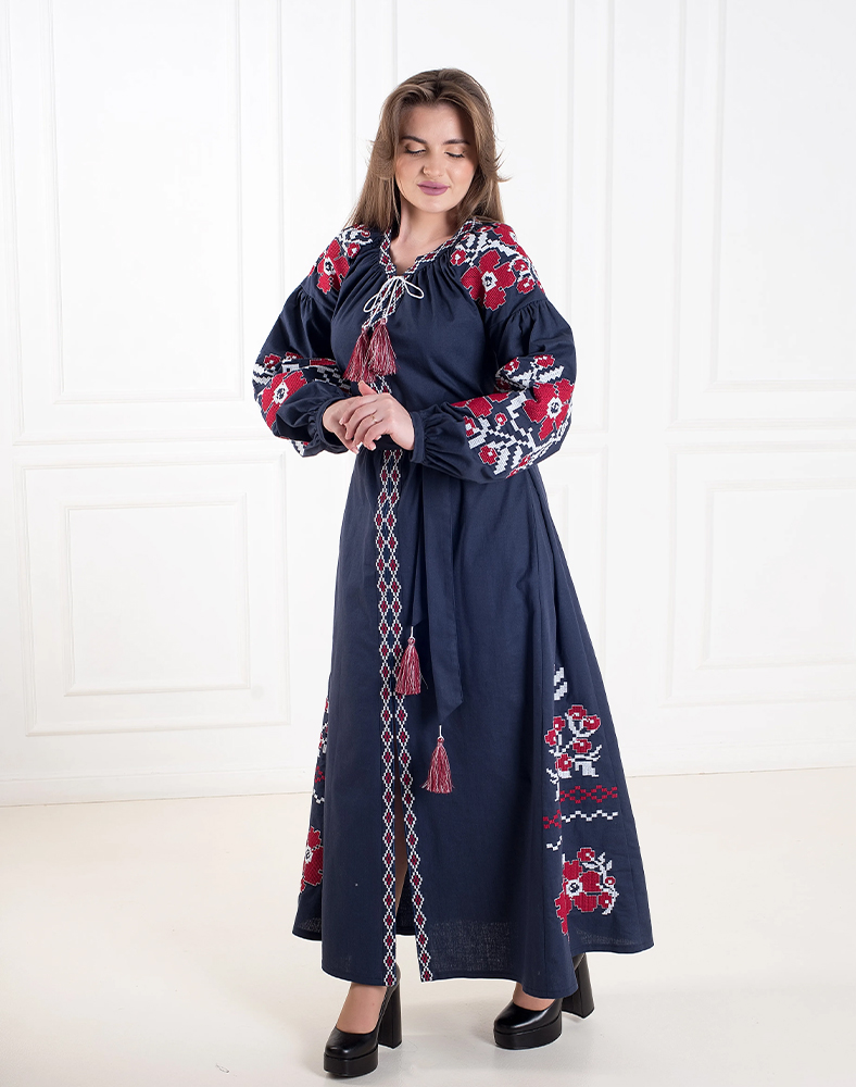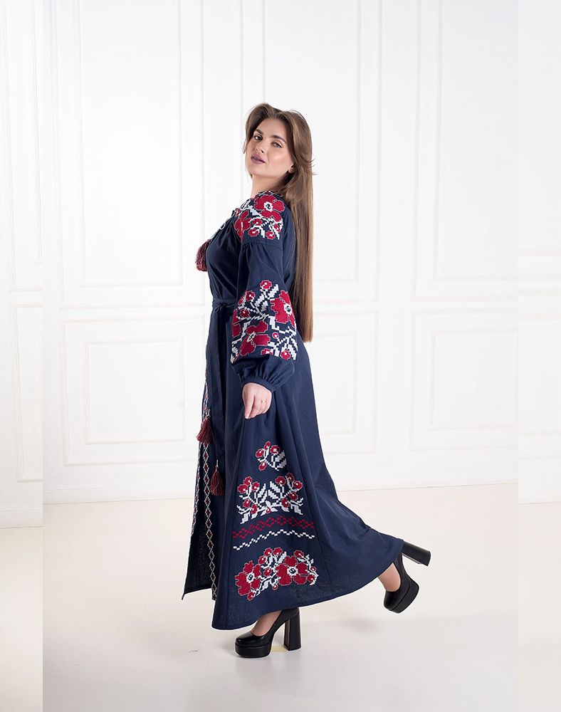 Вышитое платье «Пражский букет» (синяя с вишнёвым)