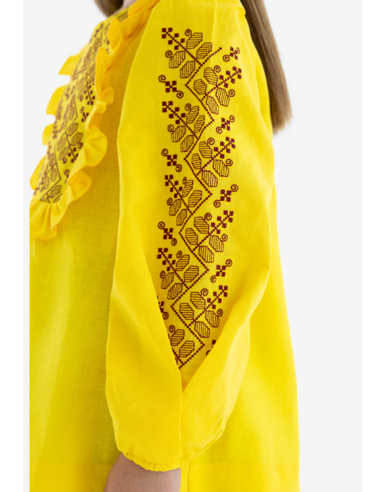 Детали: орнаментальная вышивка на кокетке и рукавах, декоративные рюши, длинные рукава на манжетах
