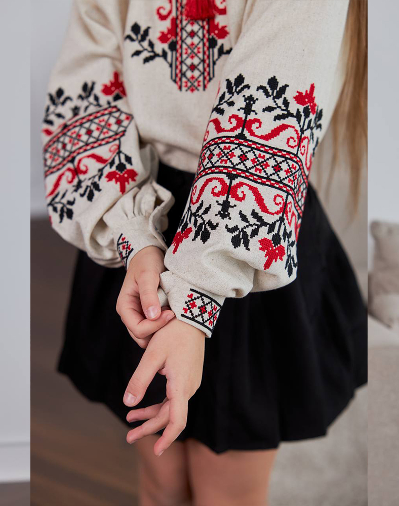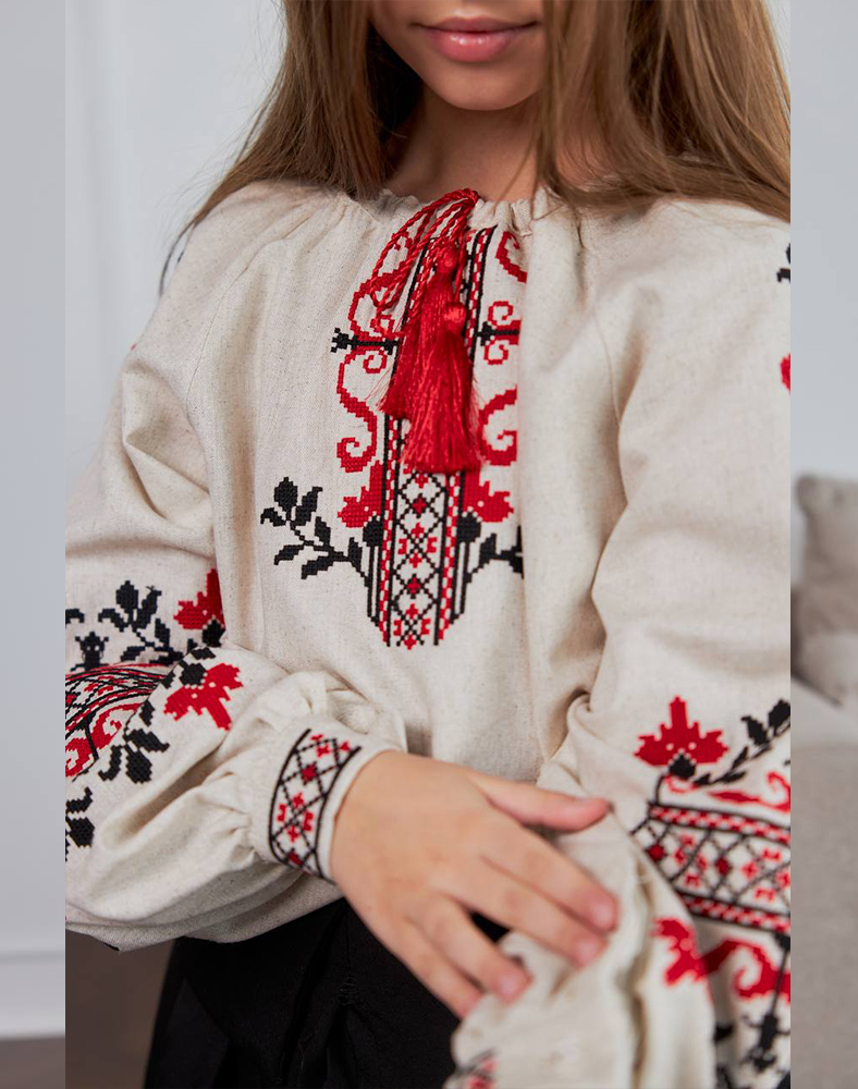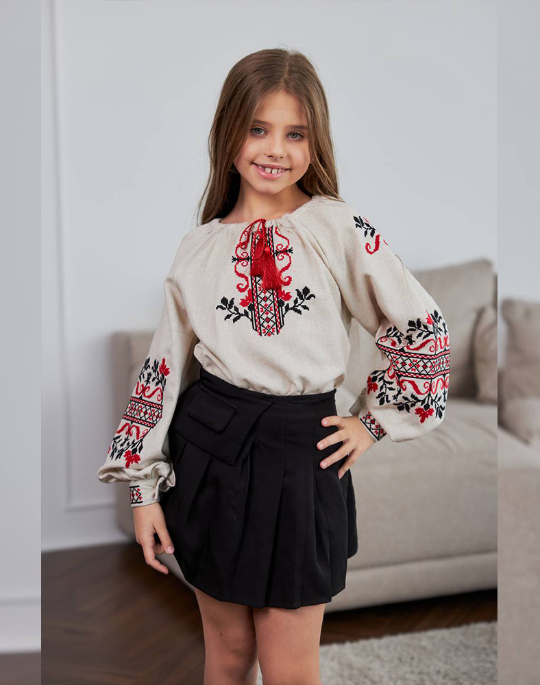 Вышиванка «Виктория» в натуральном цвете с красно-черной вышивкой – настоящий оберег украинских традиций для маленькой модницы. Классическое сочетание цвета символизирует силу, любовь и защиту, а свободный крой обеспечивает комфорт во время движения. Такая рубашка подойдет и для праздников, и для повседневной носки.