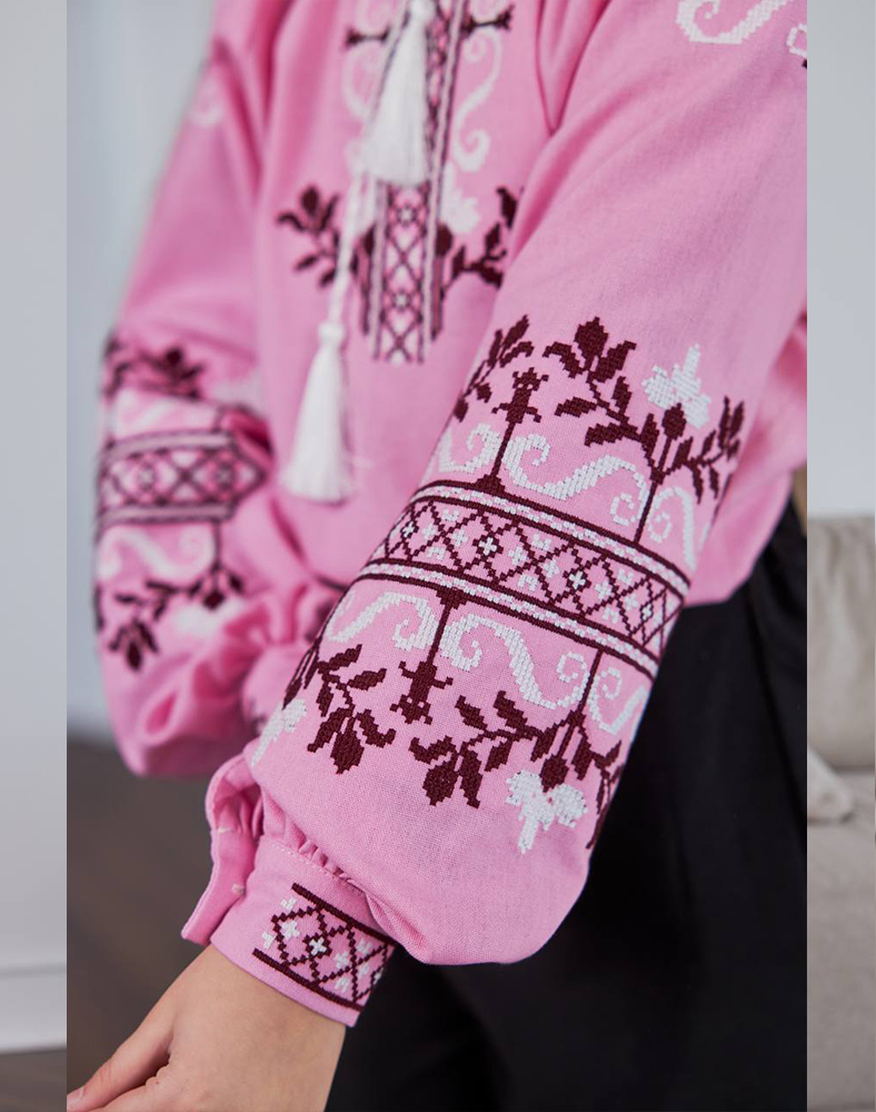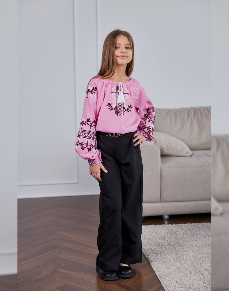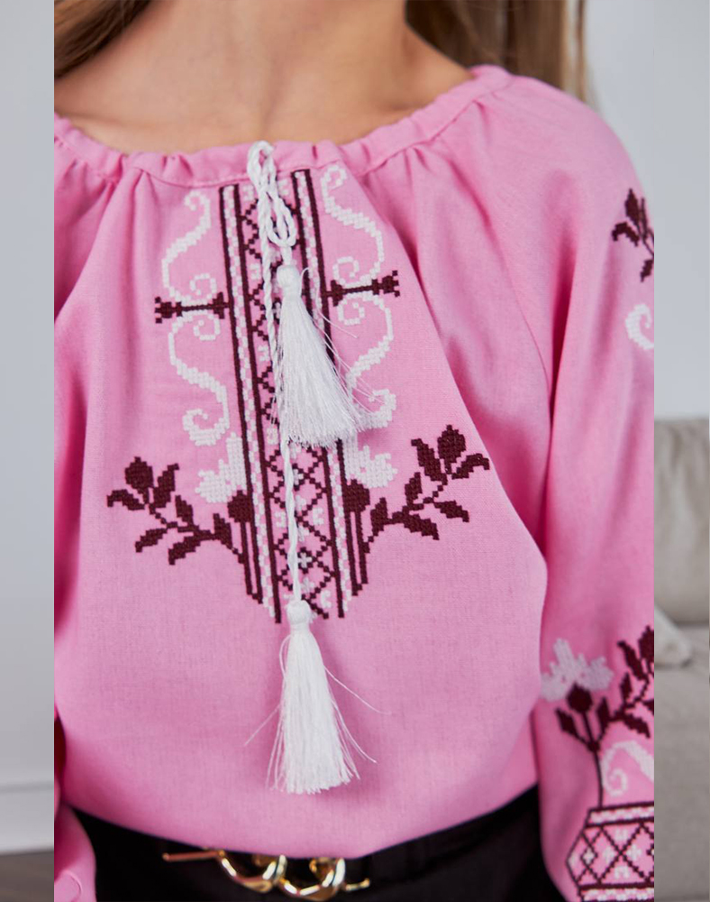 Вышиванка для девочки «Виктория» розовая, льняная, длинный рукав.