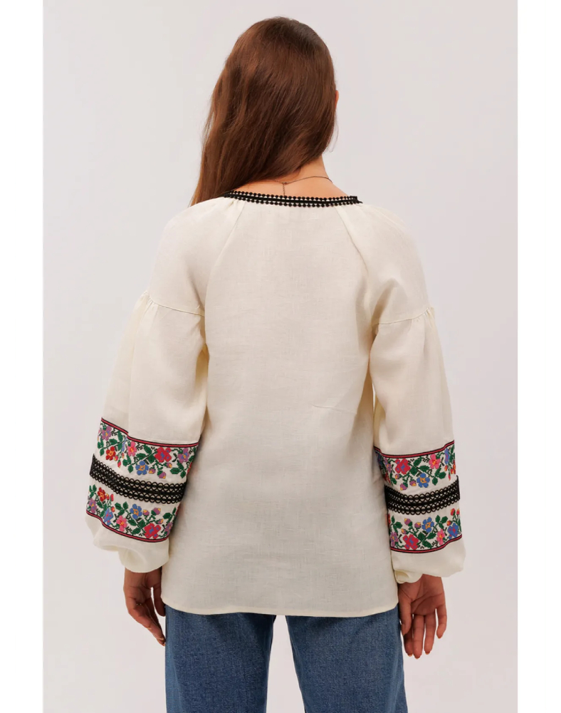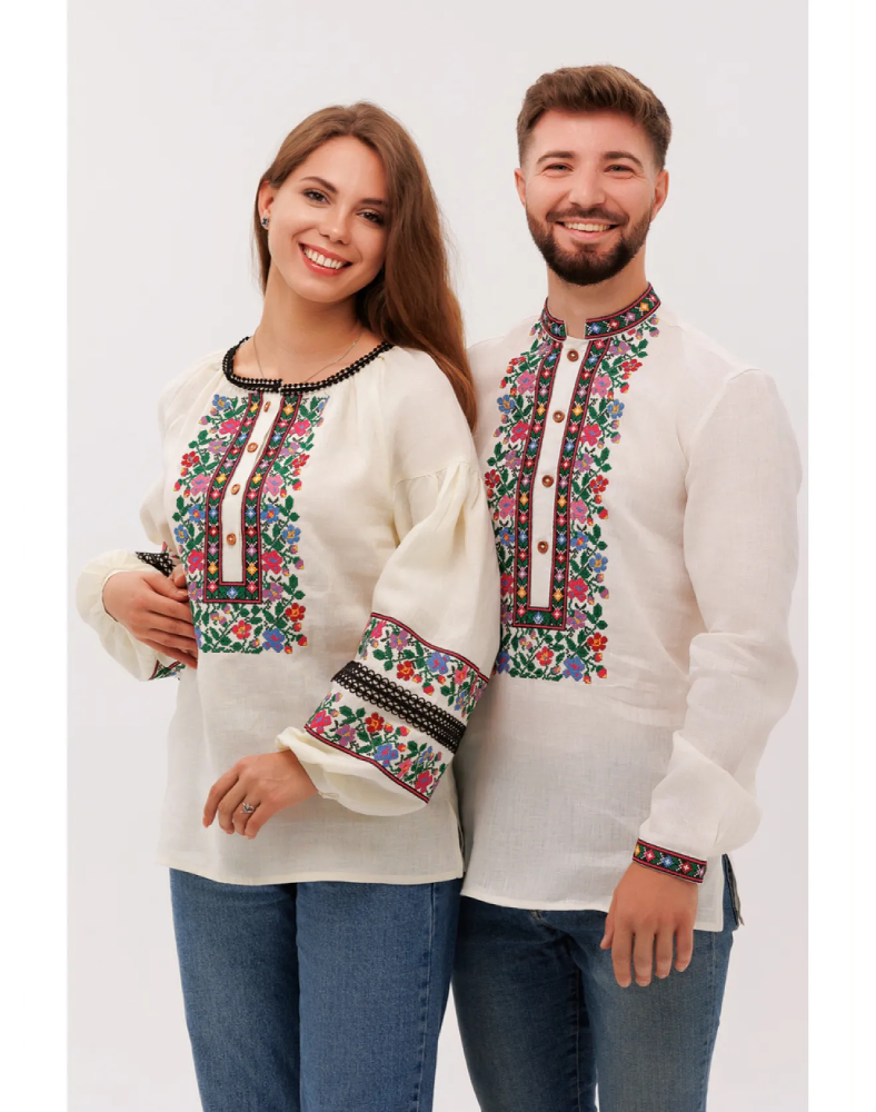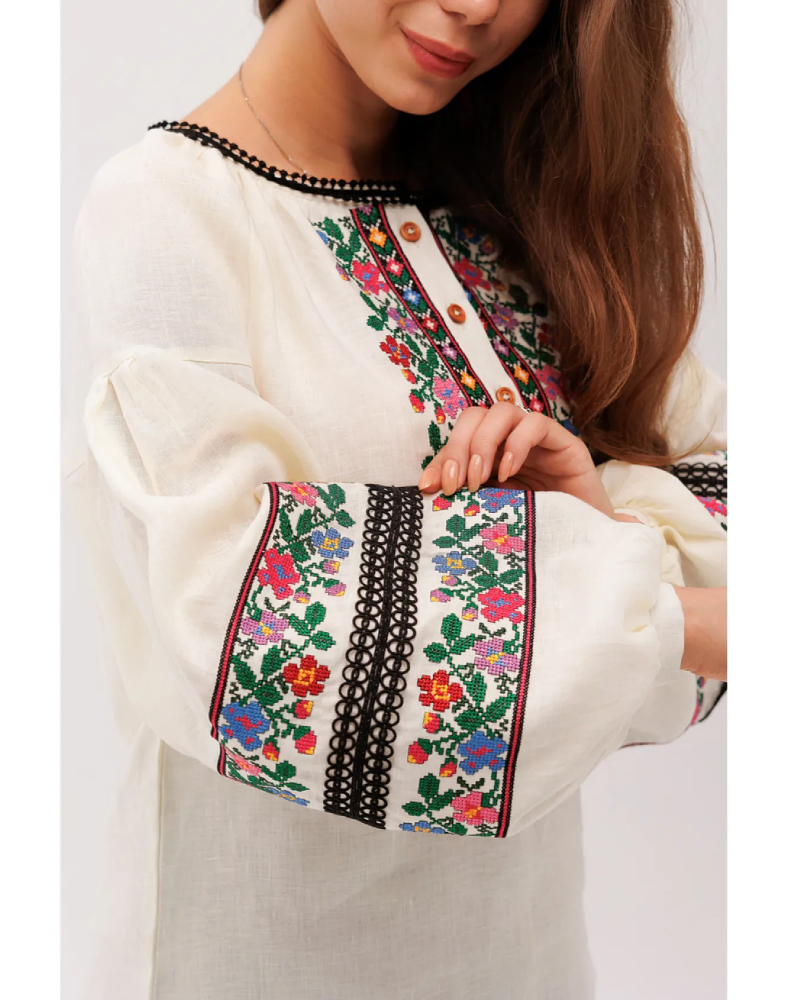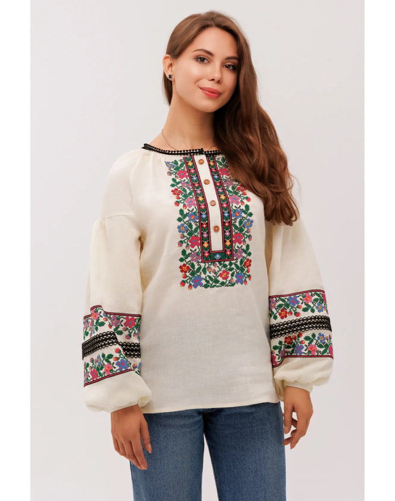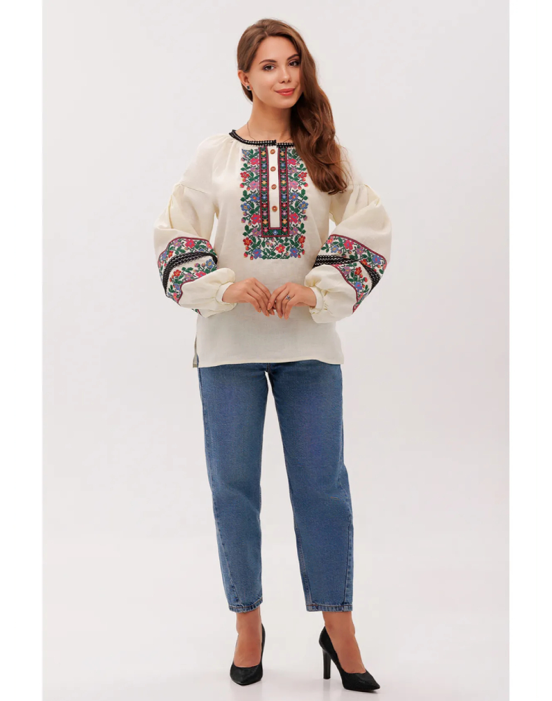 Вышиванка «Добродия» — это изысканная женская модель, в которой натуральный кремовый лён, пышные рукава и богатый растительный орнамент создают по-настоящему праздничный и в то же время очень живой образ. Она выглядит нежно, благородно и выразительно, легко привлекая внимание сложной композицией вышивки и мягким тёплым оттенком ткани. Такая модель станет красивым акцентом гардероба и подчеркнёт индивидуальность своей обладательницы.