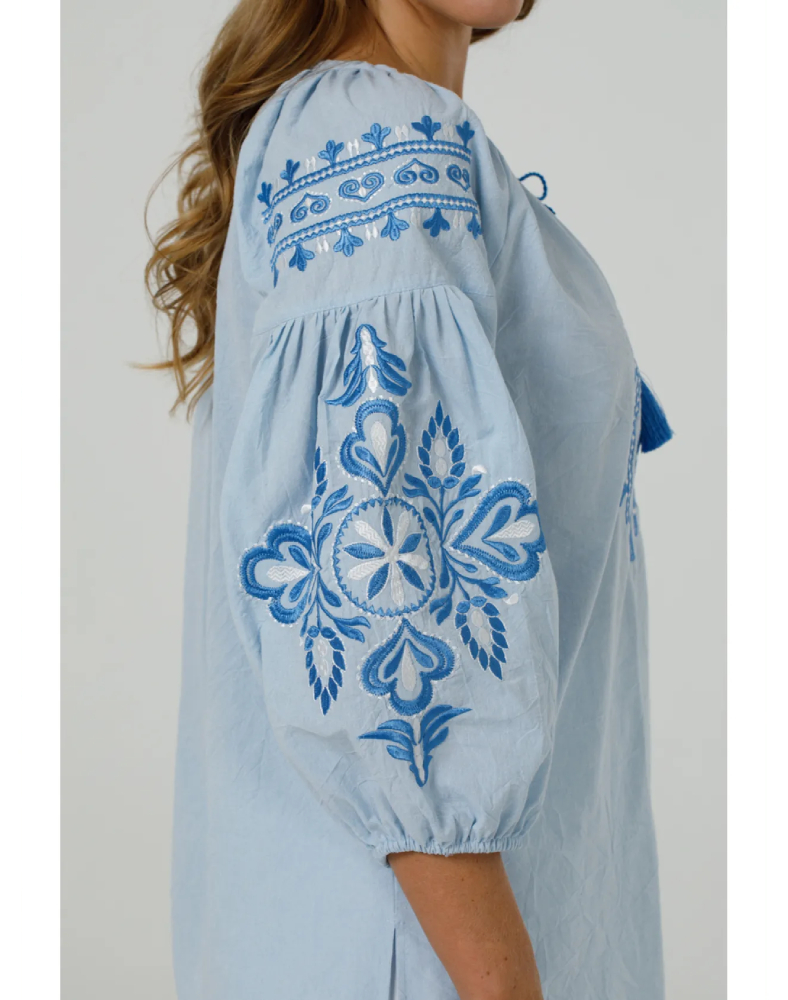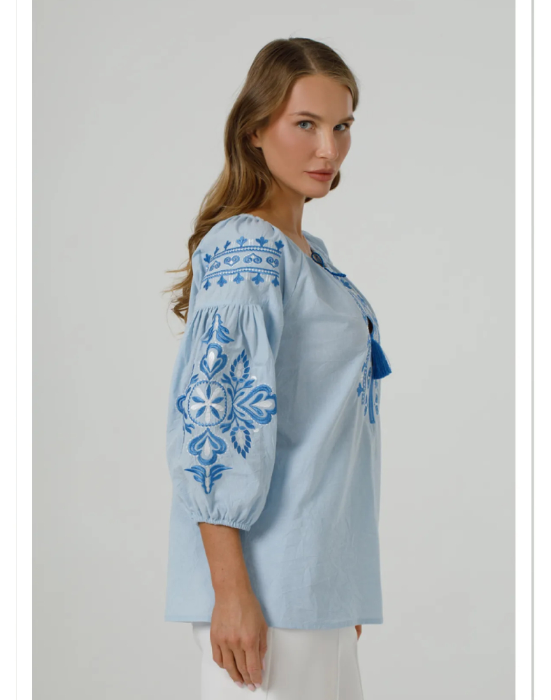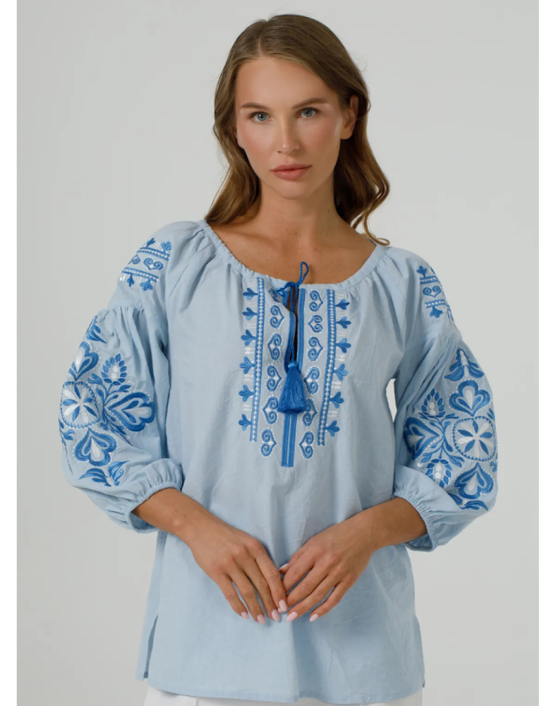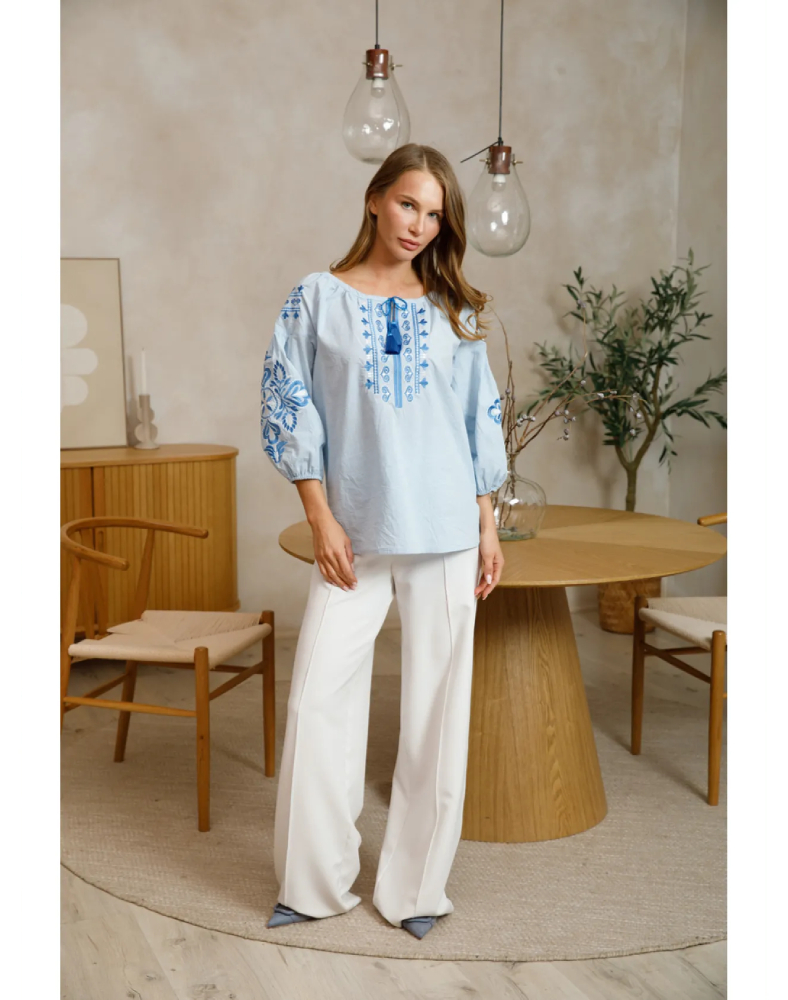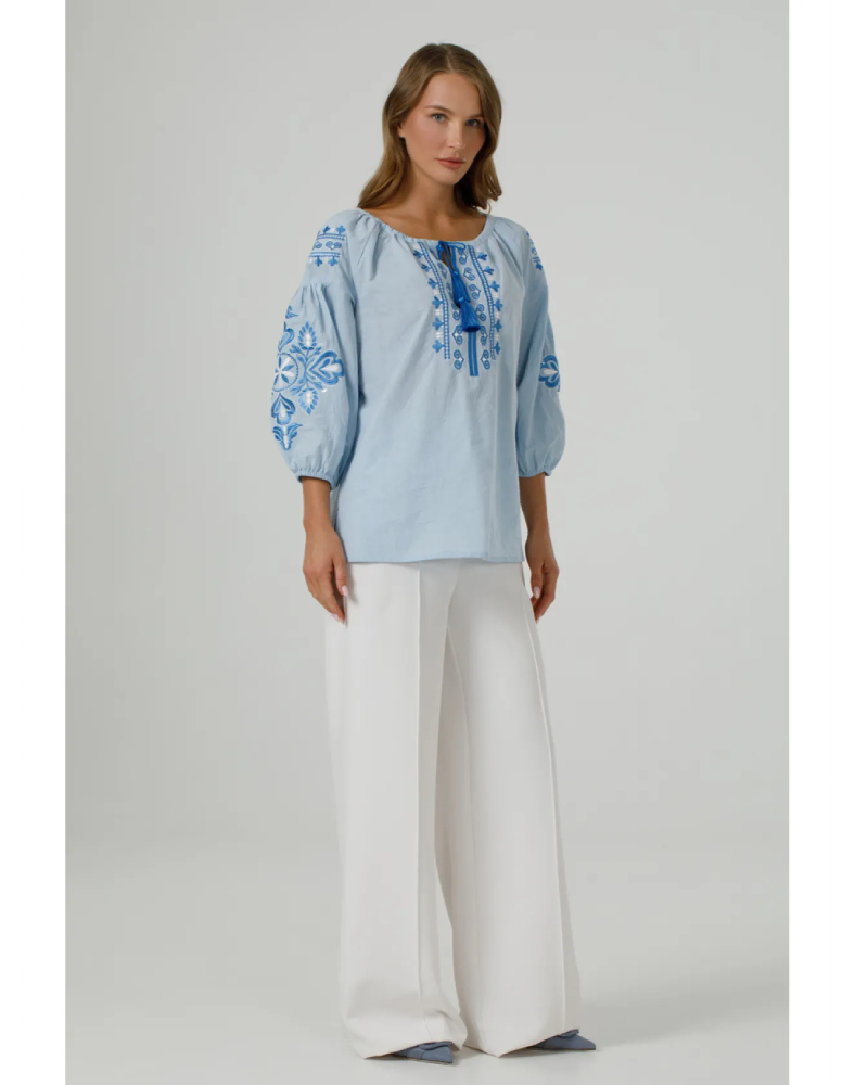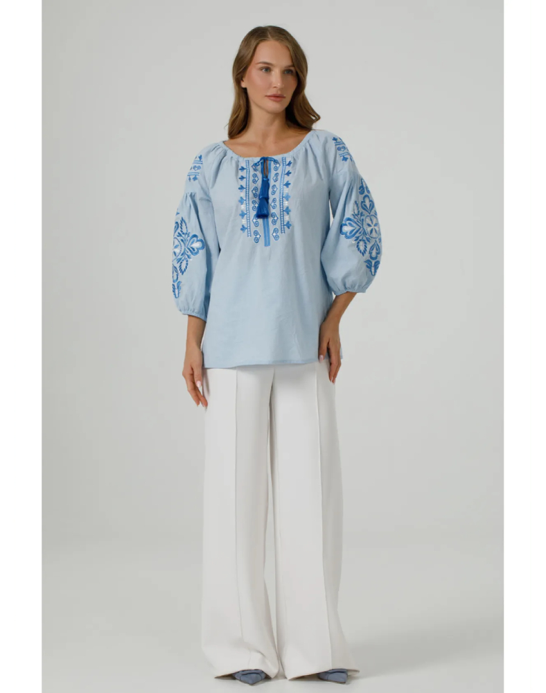 Вышиванка «Полонея» голубая — это лёгкая, свежая и очень женственная модель, которая сочетает нежный цвет ткани, комфорт натурального хлопка и выразительную вышивку в тон. Она выглядит деликатно, аккуратно и в то же время нарядно, поэтому легко впишется как в повседневный гардероб, так и в образ для особых событий. Голубой оттенок придаёт изделию мягкость, а орнамент создаёт ощущение завершённости и стиля.