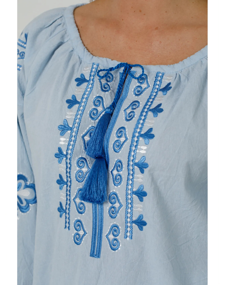 Детали: вышивка на рукавах и передней части, завязки с кисточками
