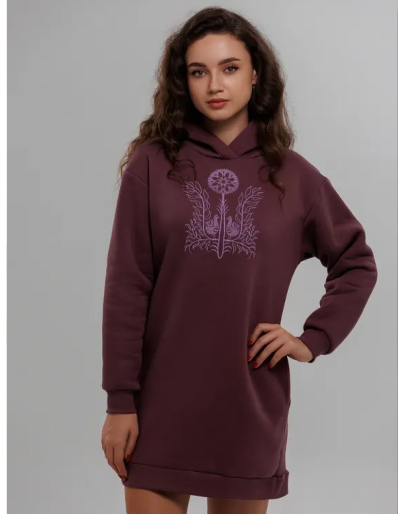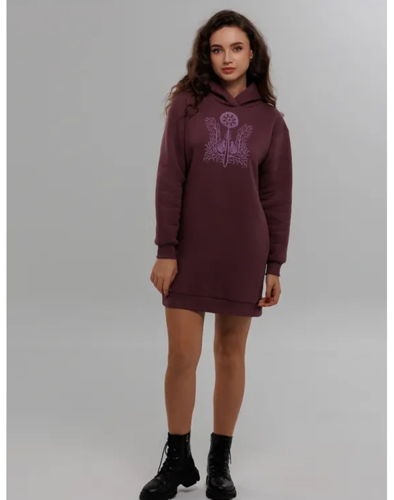 Женская туника-худи Світанок — тёплая туника из футера с начёсом, фиолетово-коричневая, длинный рукав, стильный принт