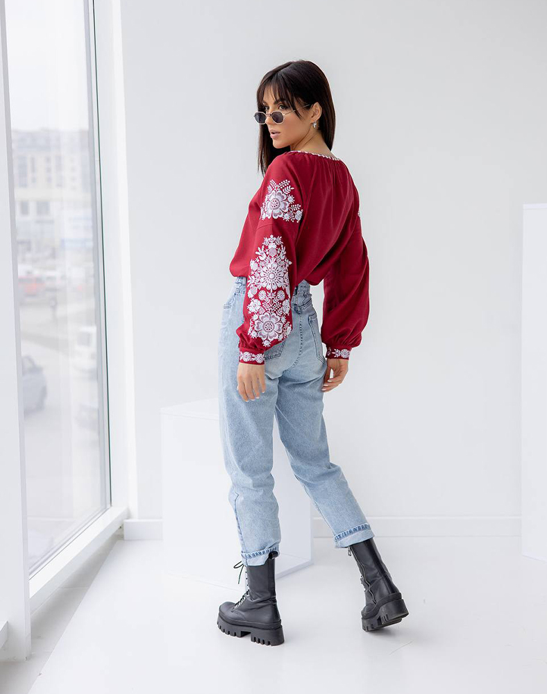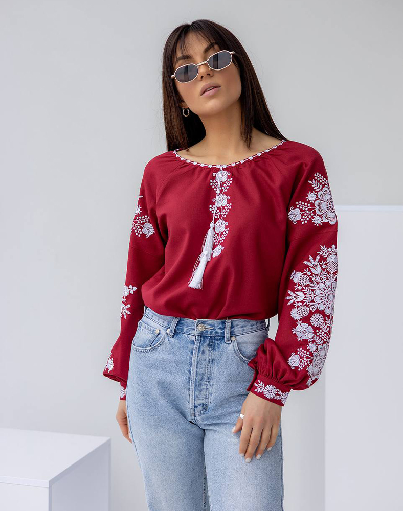 Женская вышитая рубашка «Мандры» бордовая, льняная, длинный рукав