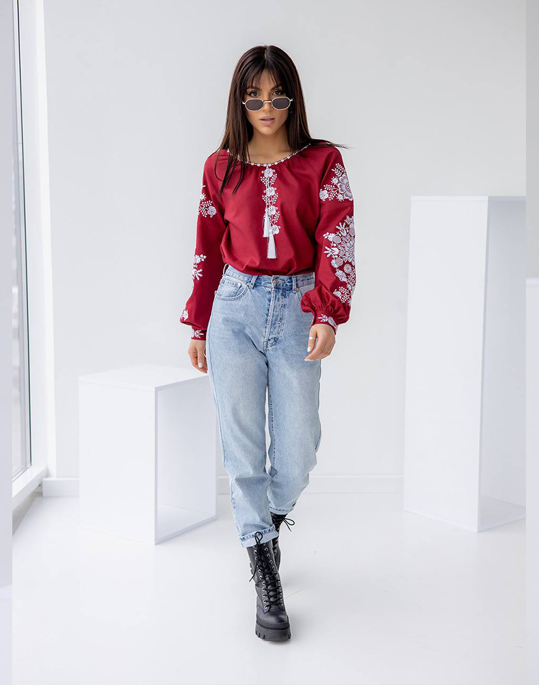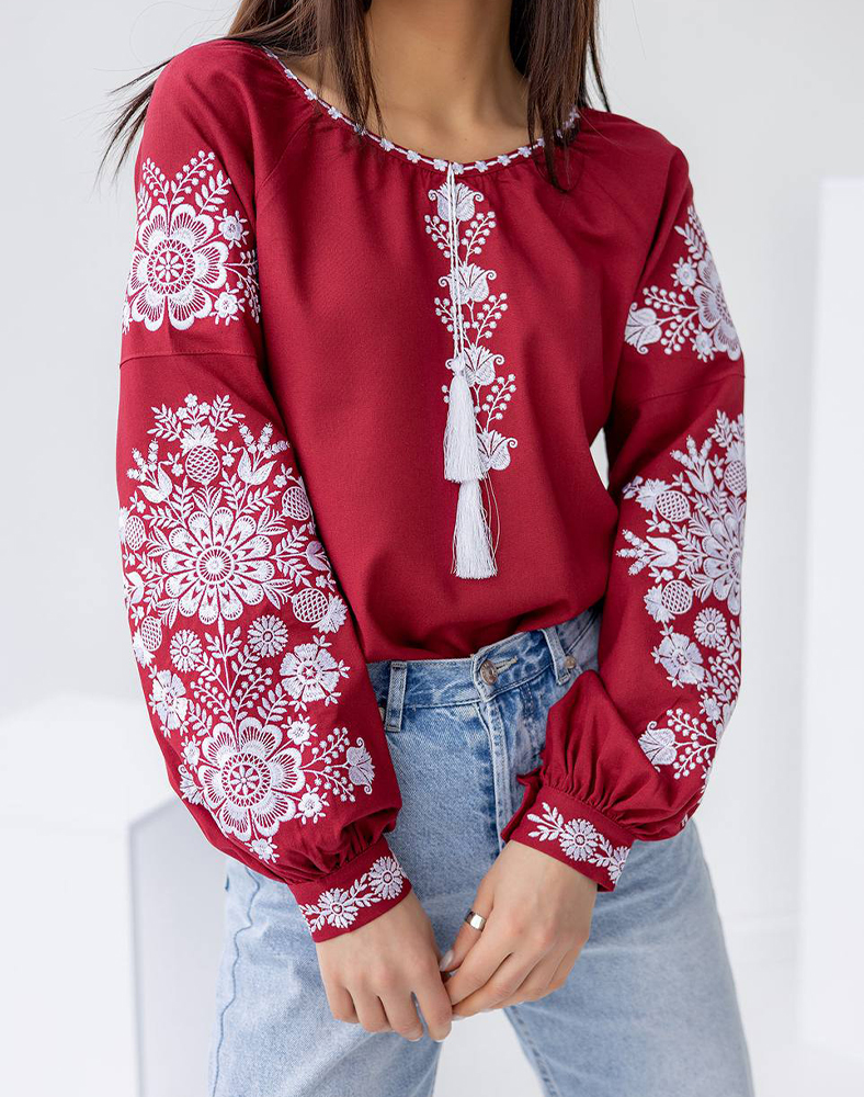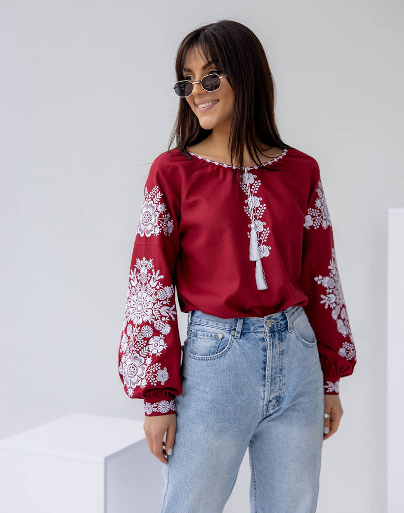Эта вышиванка имеет собственную историю и характер — она уже побывала в разных уголках Украины и дарит свою красоту повсюду, куда отправляется. Бордовый цвет придает благородство, а белая вышивка «гладью» создает нежный контраст, подчеркивающий женственность и элегантность. Это не просто сорочка, а спутница в путешествиях и ярких моментах жизни.