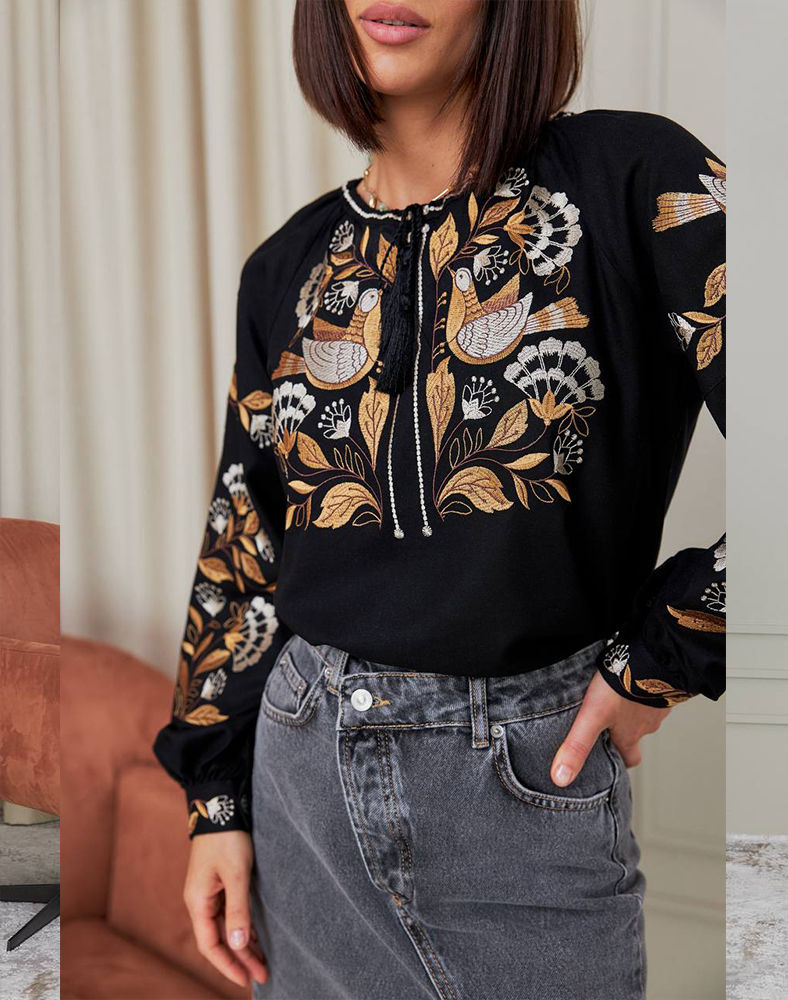 Женская вышитая рубашка «Птицы» черная, льняная, длинный рукав