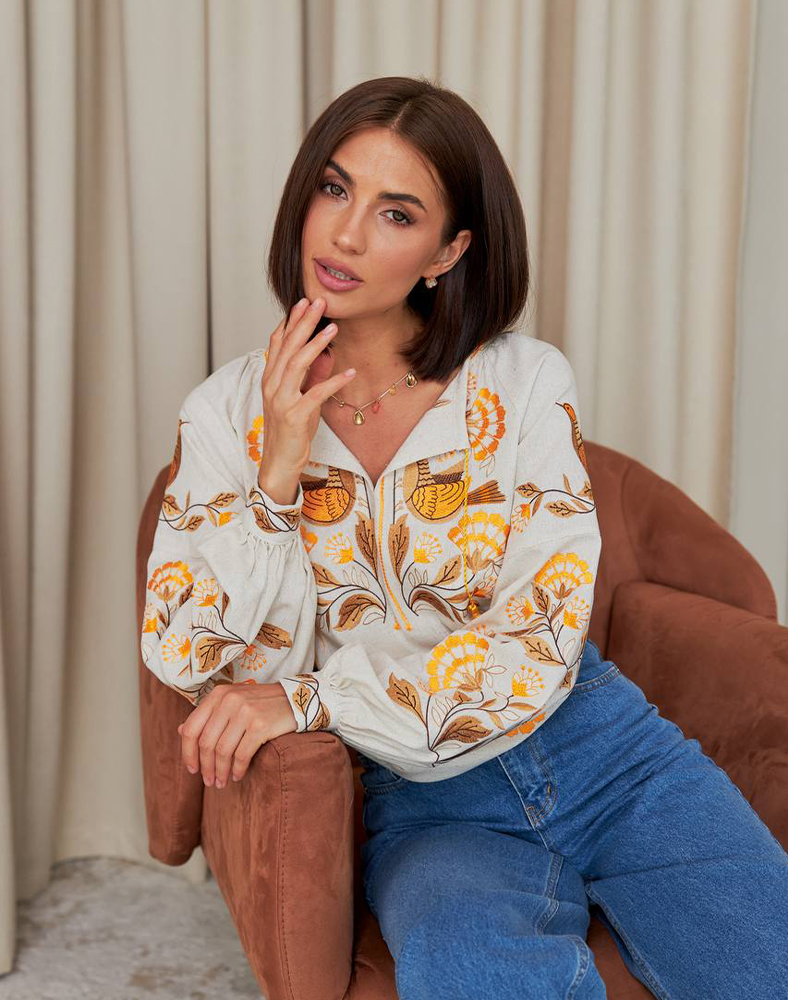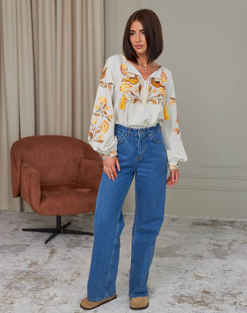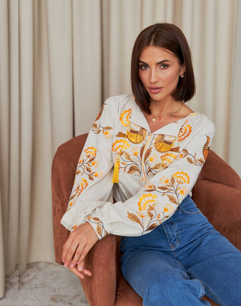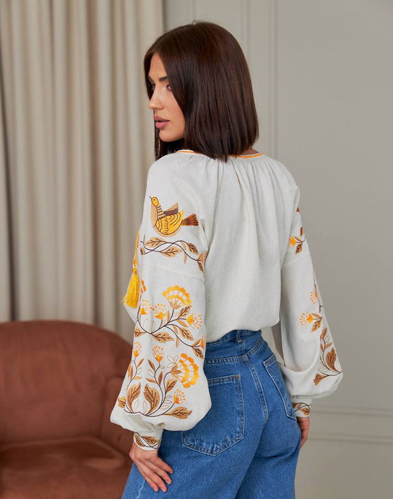 Вышиванка «Птицы» в нежном молочном цвете украшена яркой вышивкой в ​​желто-оранжевых оттенках. Символические птицы и растительные мотивы создают образ, излучающий радость, гармонию и благополучие. Натуральная ткань из льна с примесями вискозы дарит легкость и комфорт в носке, а свободный крой делает рубашку универсальной – для праздничных событий или стильных повседневных лугов.