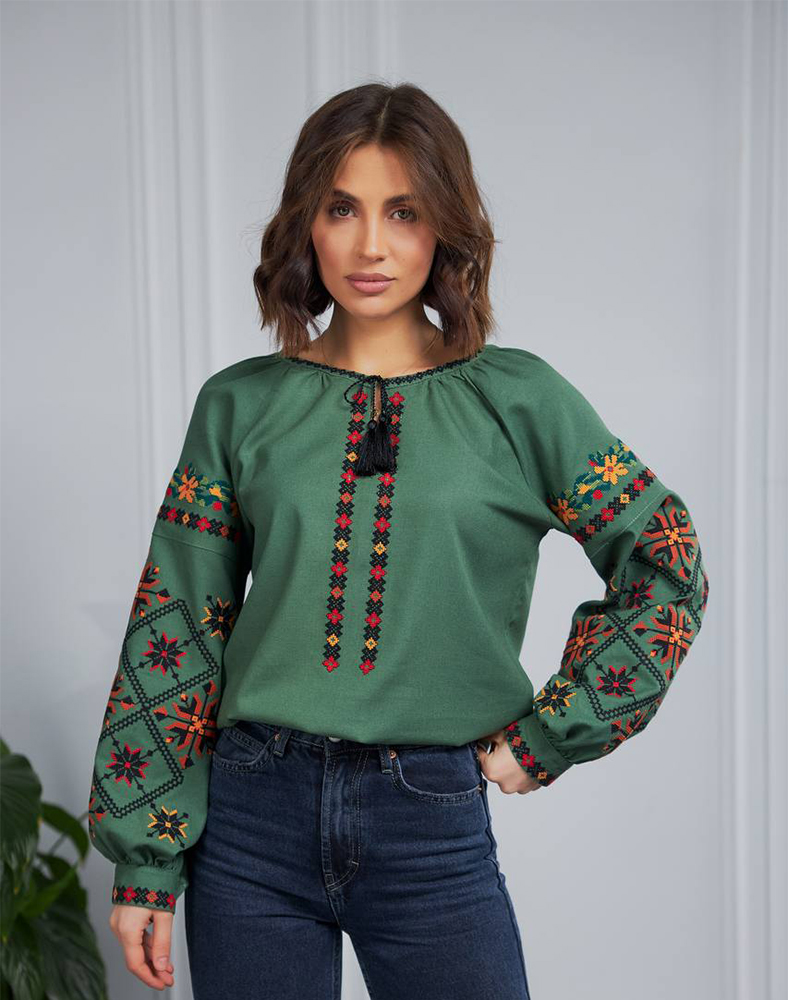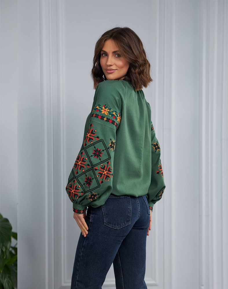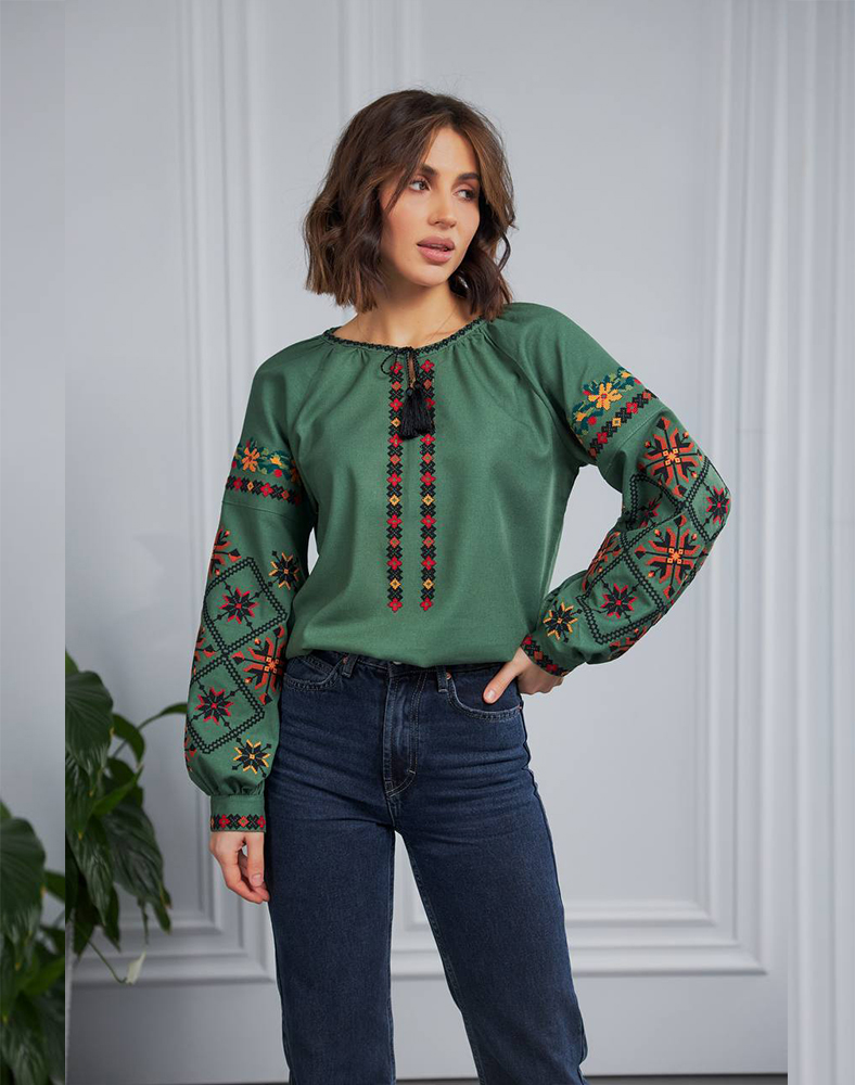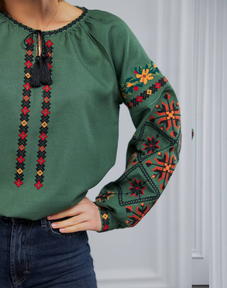 Женская вышиванка «Красная роза» зеленая, длинный рукав