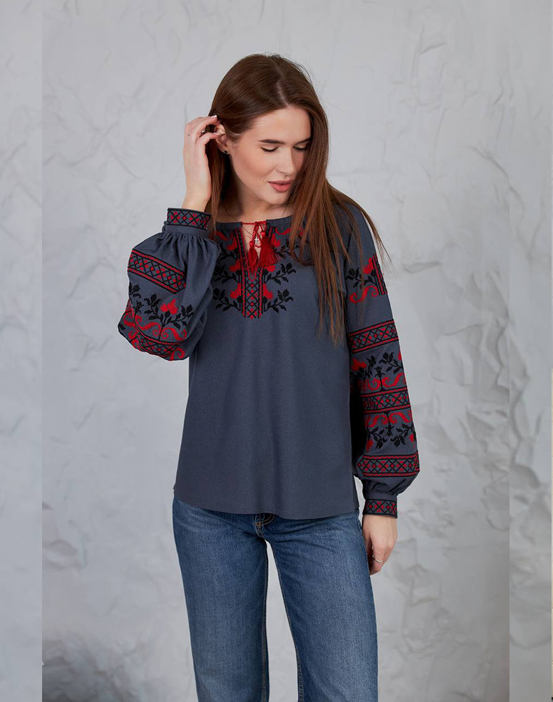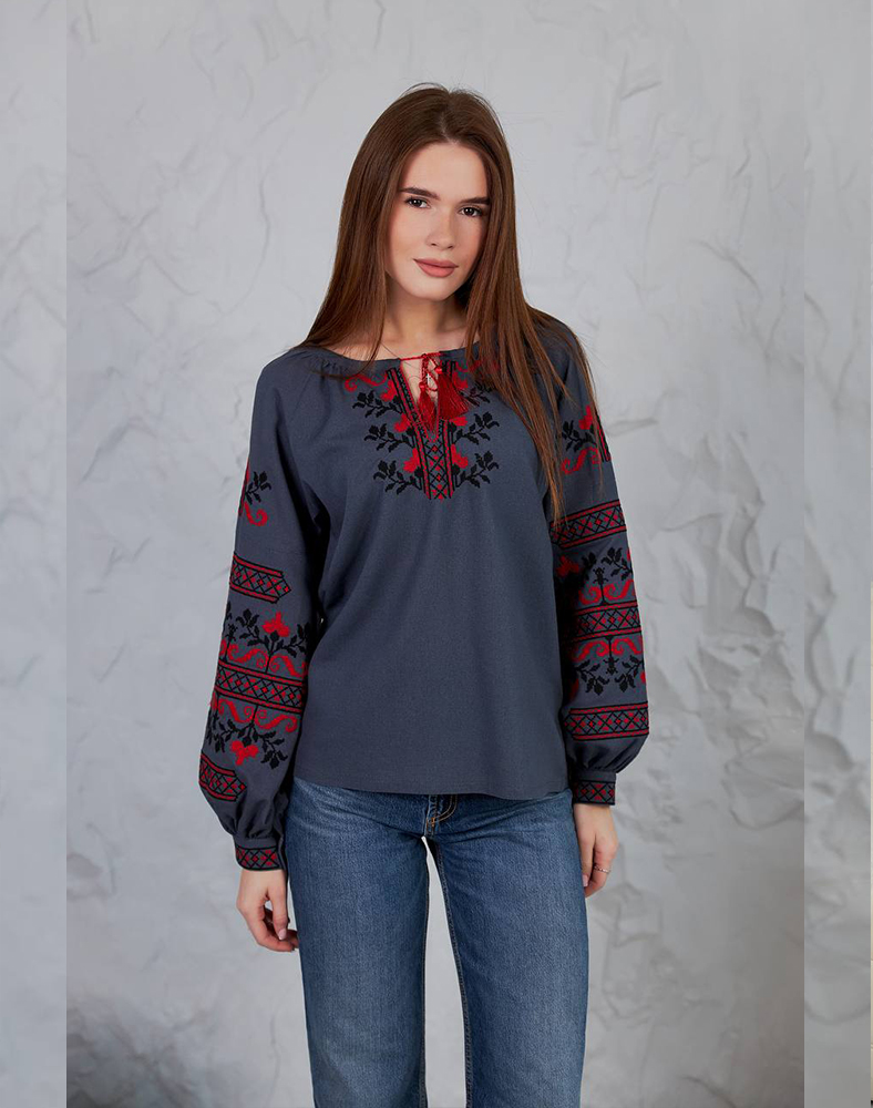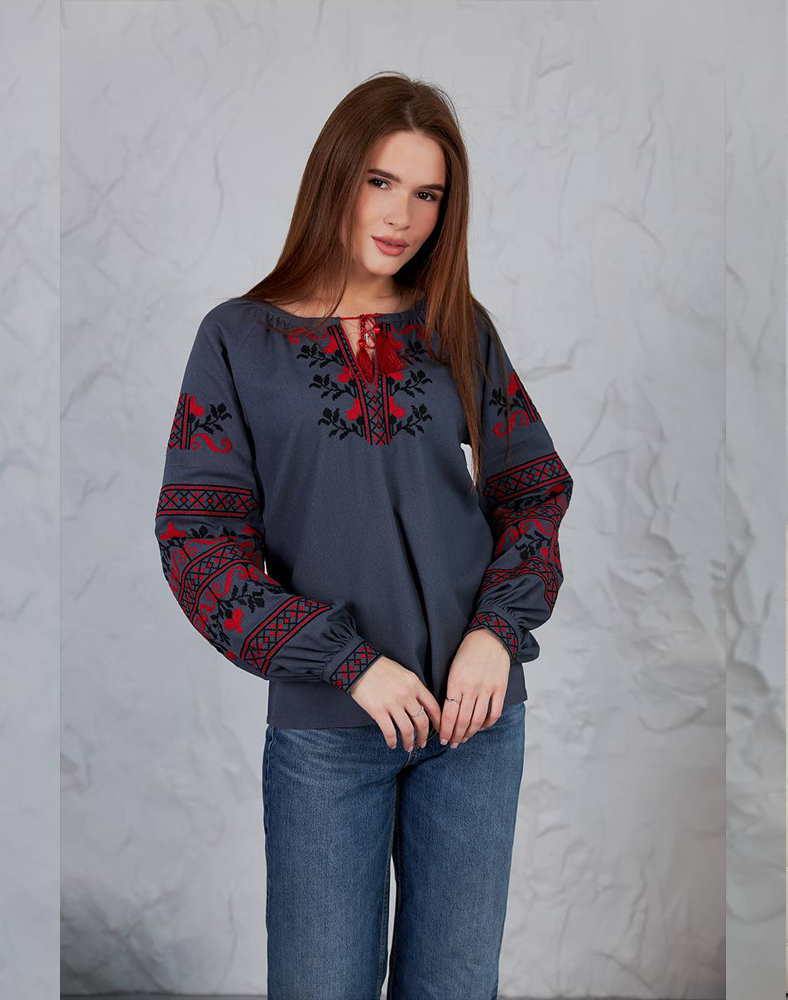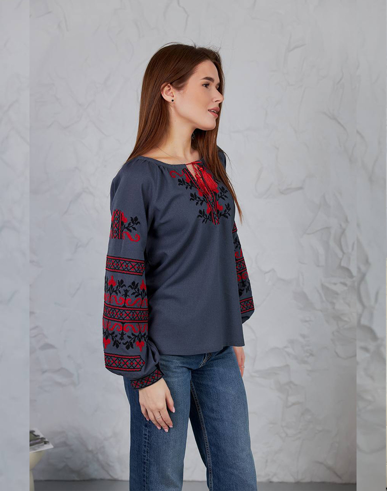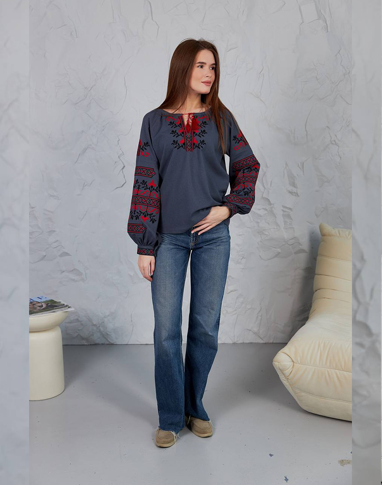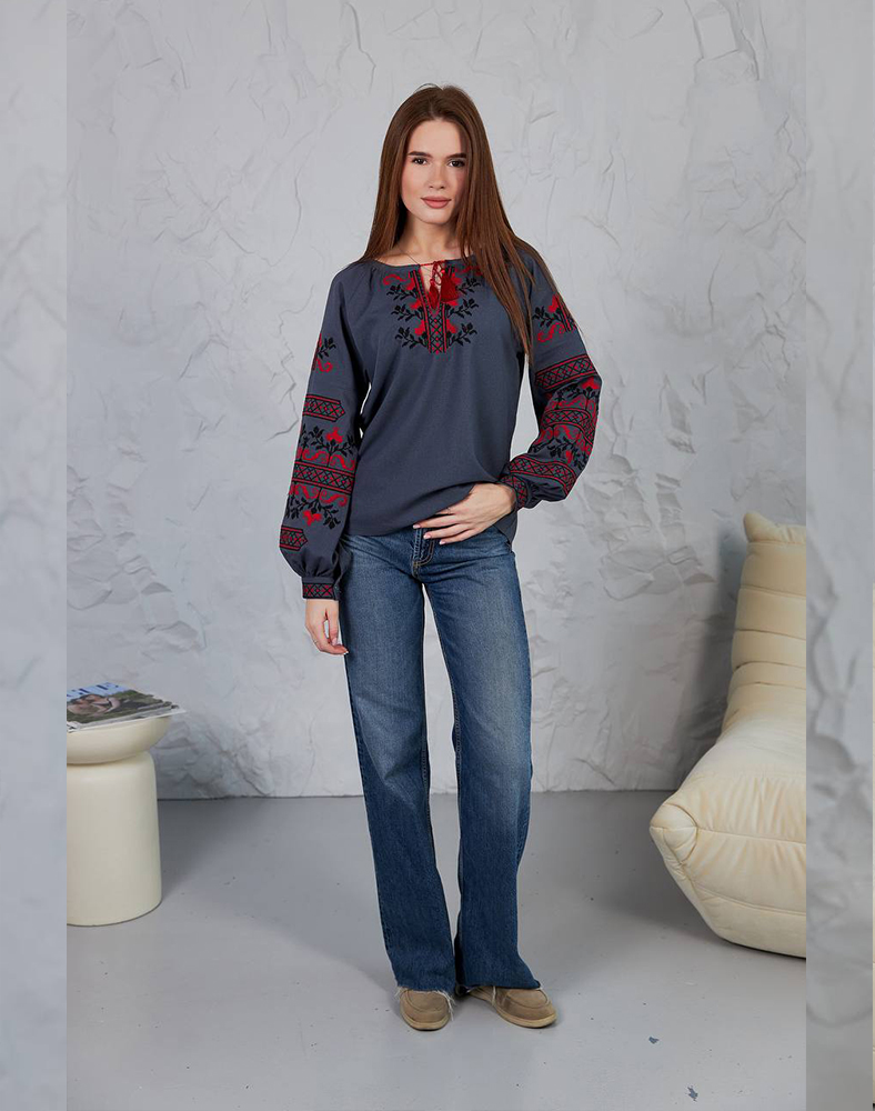 Рубашка «Виктория» в сером цвете – стильное решение для женщин, которые ценят современность и традиции. Красный и черный орнамент на груди и рукавах выглядит контрастно и выразительно, придавая образу элегантности. Натуральный лен с примесями вискозы обеспечивает комфорт в повседневной носке и подчеркивает естественность стиля.