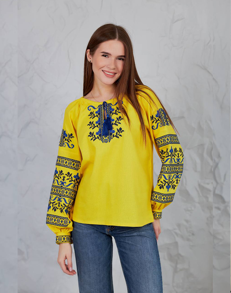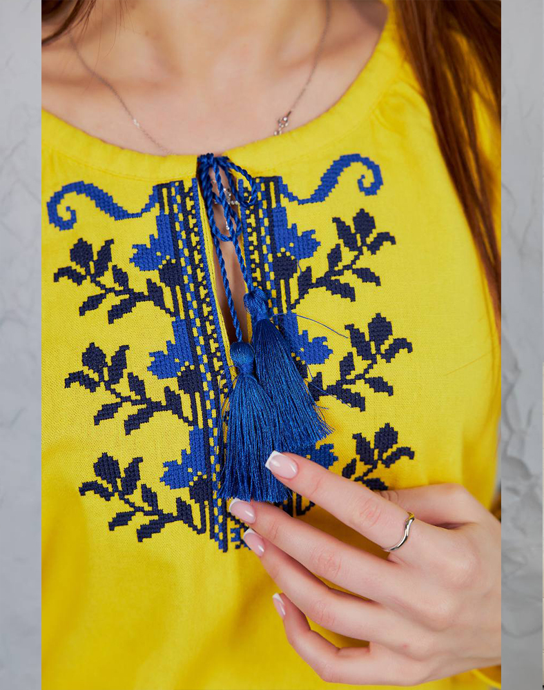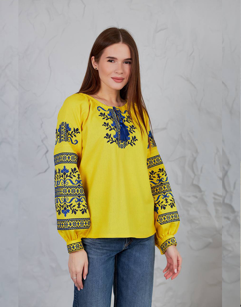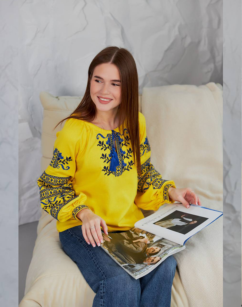 Вышиванка «Виктория» в ярко-желтом цвете – символ солнца, энергии и украинской силы. Насыщенная синяя вышивка на груди и рукавах создает выразительный контраст, делая эту модель особенно праздничной и патриотической. Натуральная ткань из льна и вискозы обеспечивает комфорт в носке, а традиционный крой подходит как для повседневных образов, так и для особых возможностей.