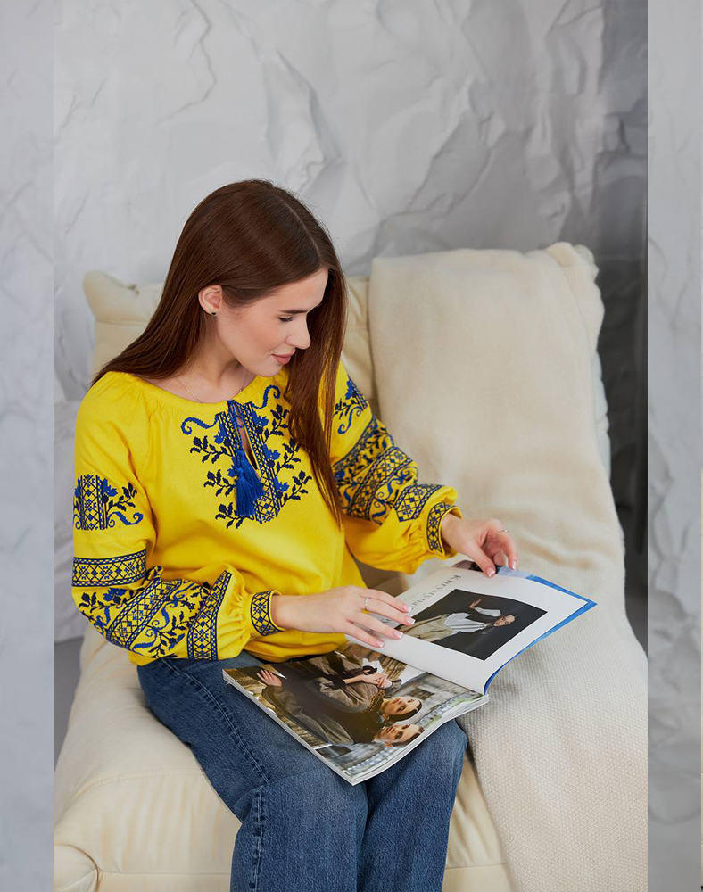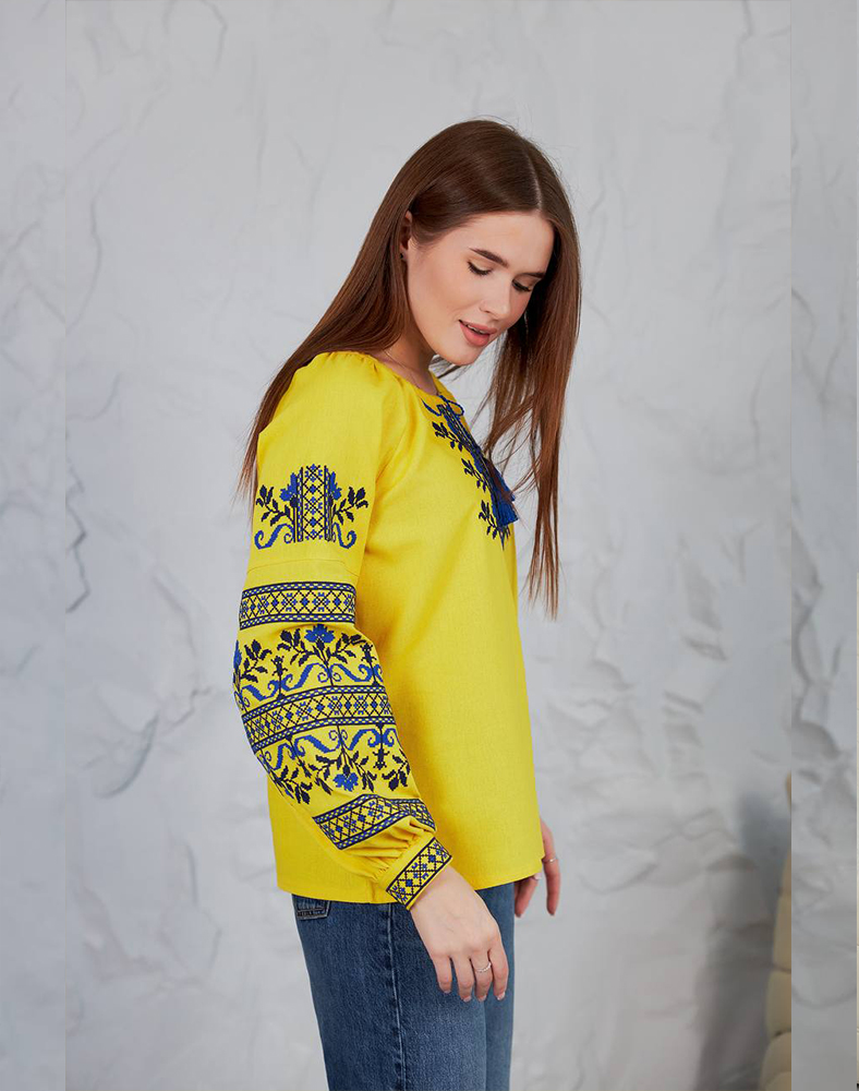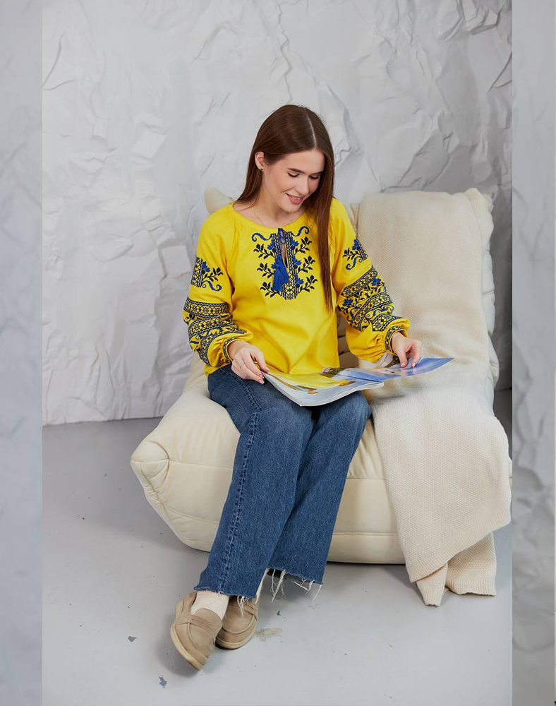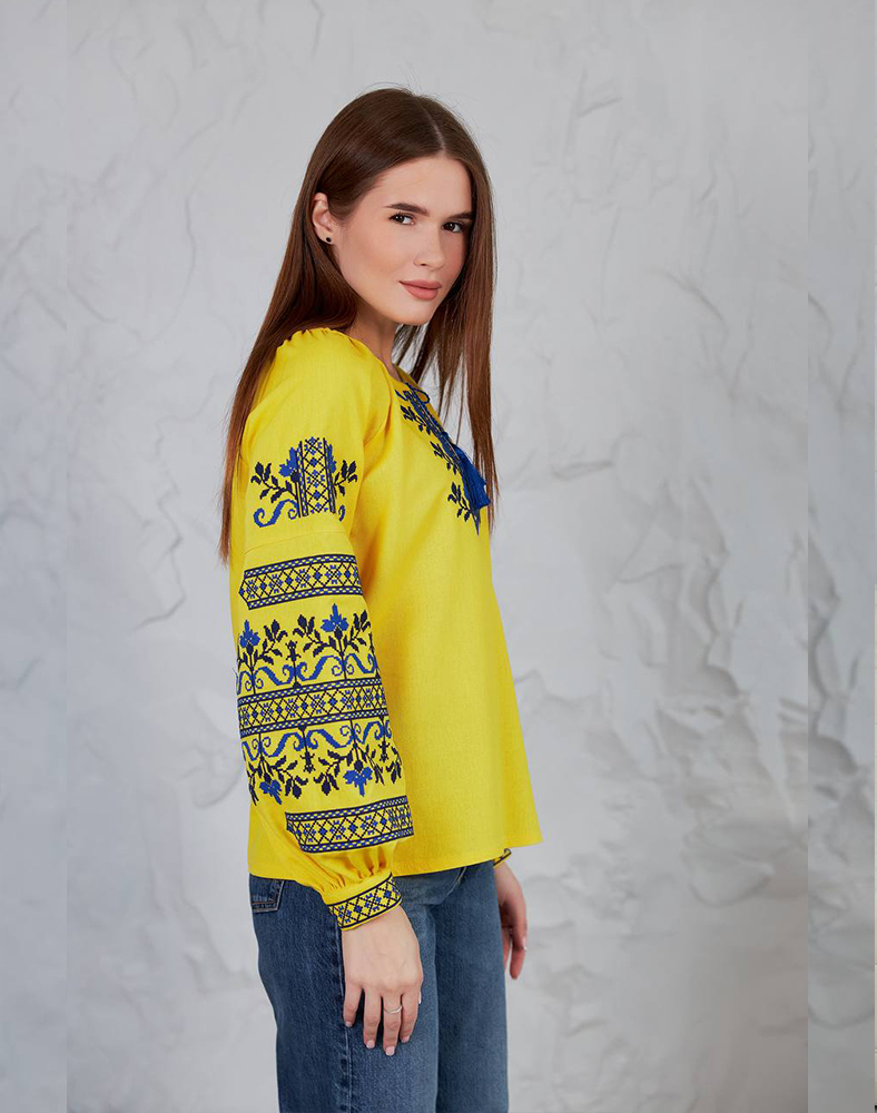 Вышиванка «Виктория» в ярко-желтом цвете – символ солнца, энергии и украинской силы. Насыщенная синяя вышивка на груди и рукавах создает выразительный контраст, делая эту модель особенно праздничной и патриотической. Натуральная ткань из льна и вискозы обеспечивает комфорт в носке, а традиционный крой подходит как для повседневных образов, так и для особых возможностей.