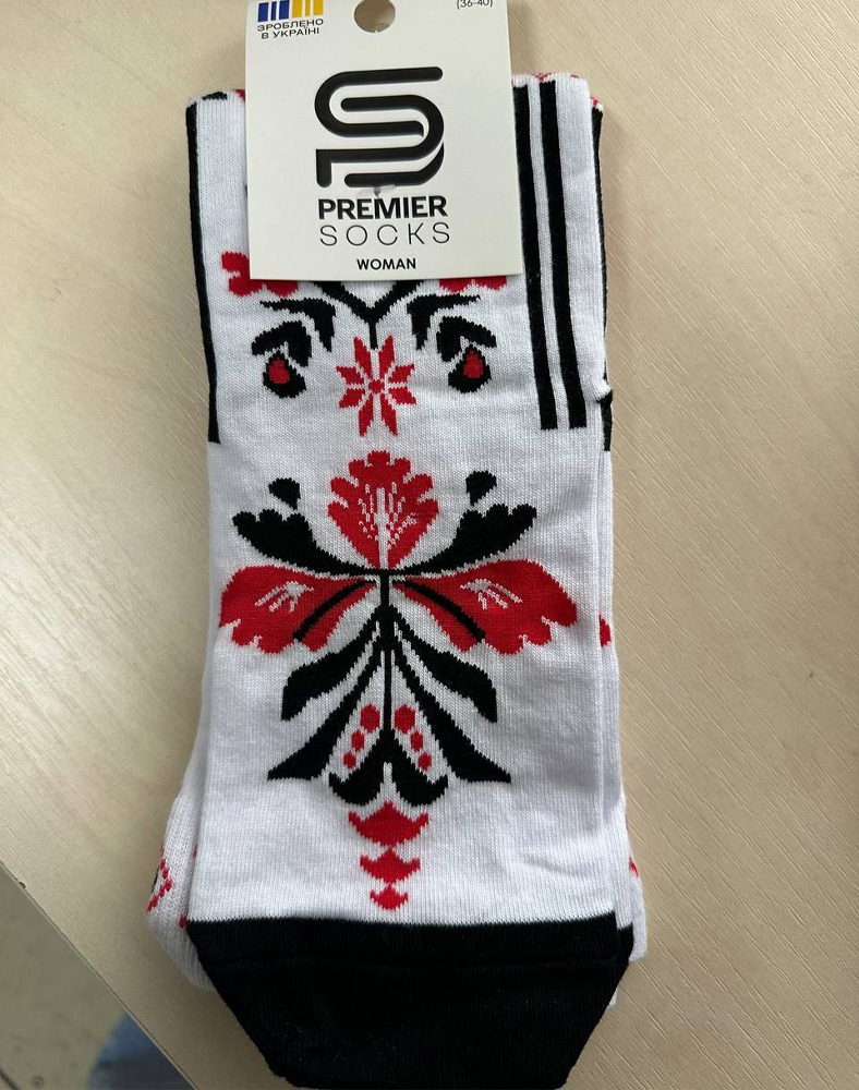 Стильные белые носки с выразительным красно-чёрным орнаментом в традиционном украинском стиле. Контрастные элементы и симметричный узор делают модель яркой, но в то же время универсальной — легко сочетается как со спортивной, так и с повседневной одеждой.