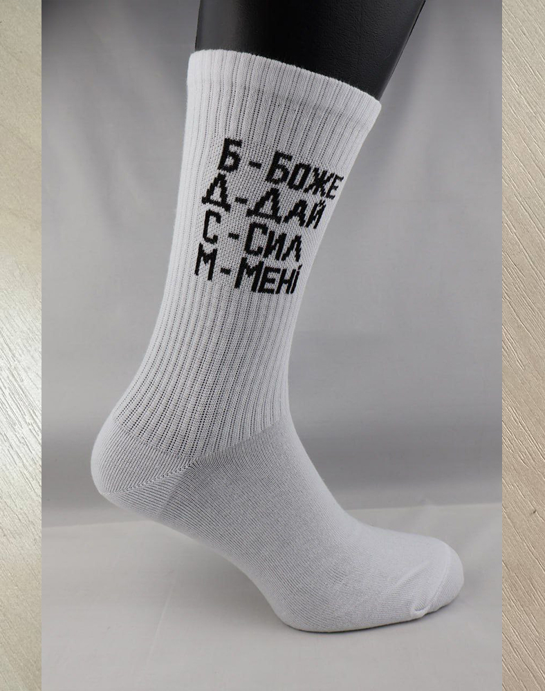 Белые женские носки с контрастной чёрной надписью в патриотическом стиле. Лаконичный дизайн с чётким текстовым акцентом выглядит сдержанно, но при этом содержательно и выразительно.