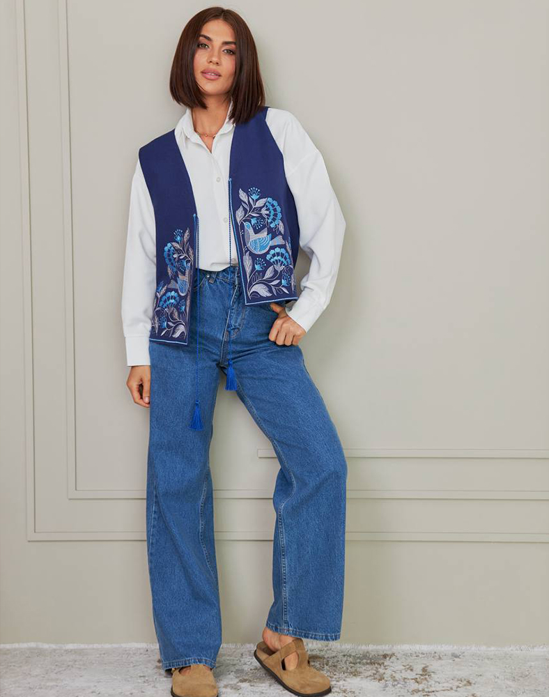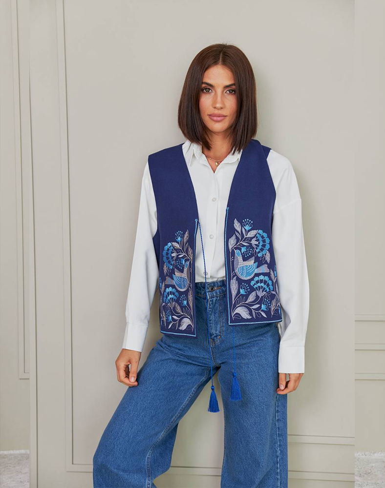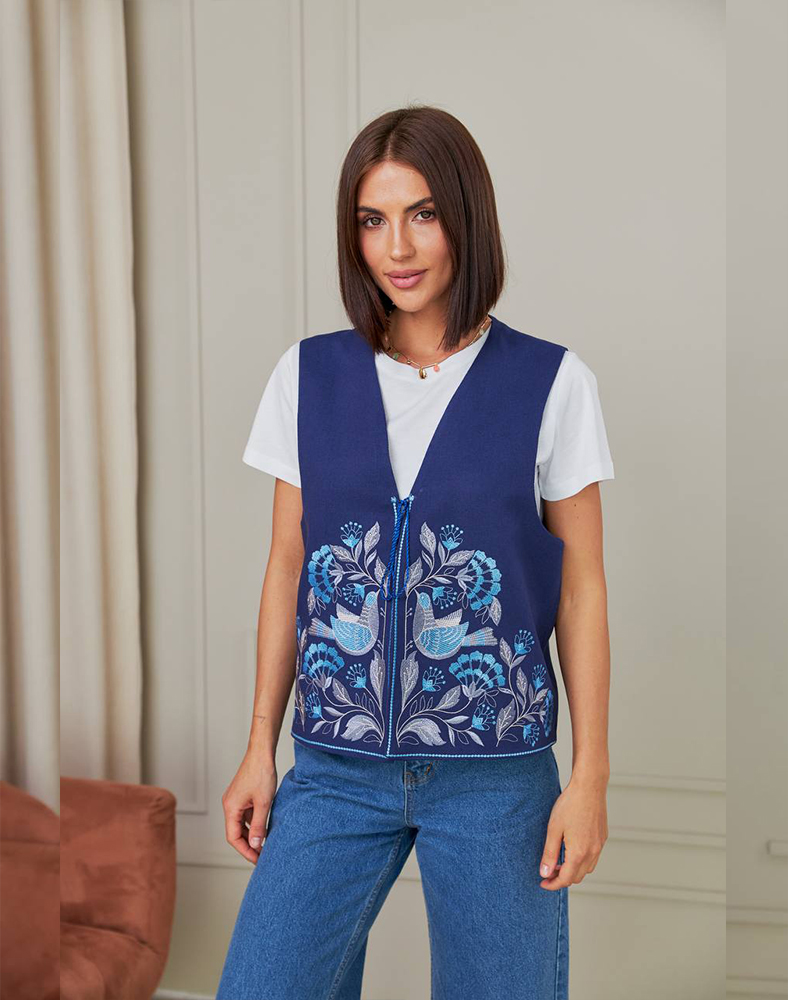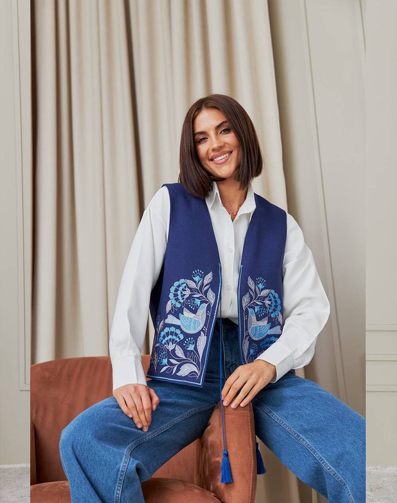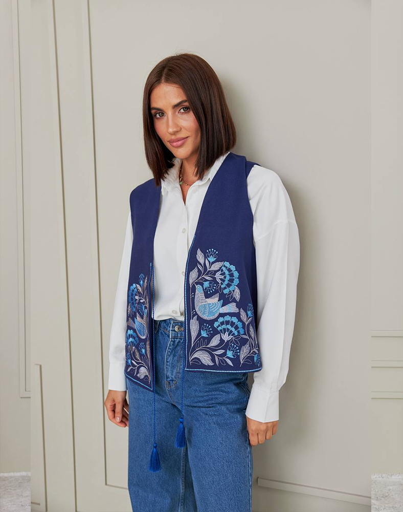 Двухсторонний жилет с новой вышивкой станет стильным акцентом в вашем гардеробе. Нежные оттенки нитей и изысканный дизайн символизируют гармонию, легкость, любовь, свободу, благополучие и мир, которого мы все так ждем . Благодаря универсальному крою он подходит к любому образу - от повседневного до праздничного.