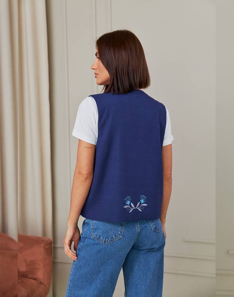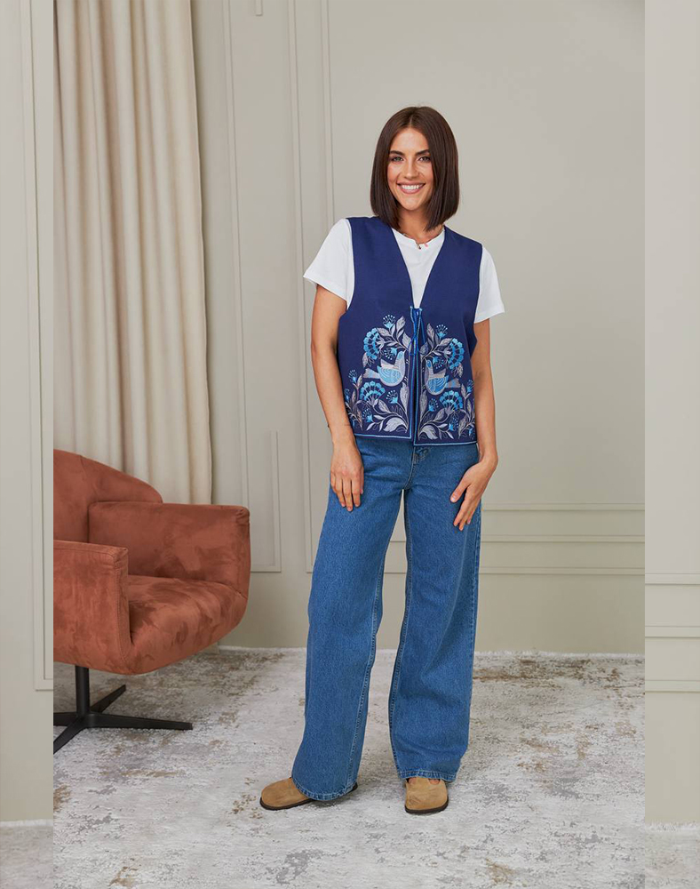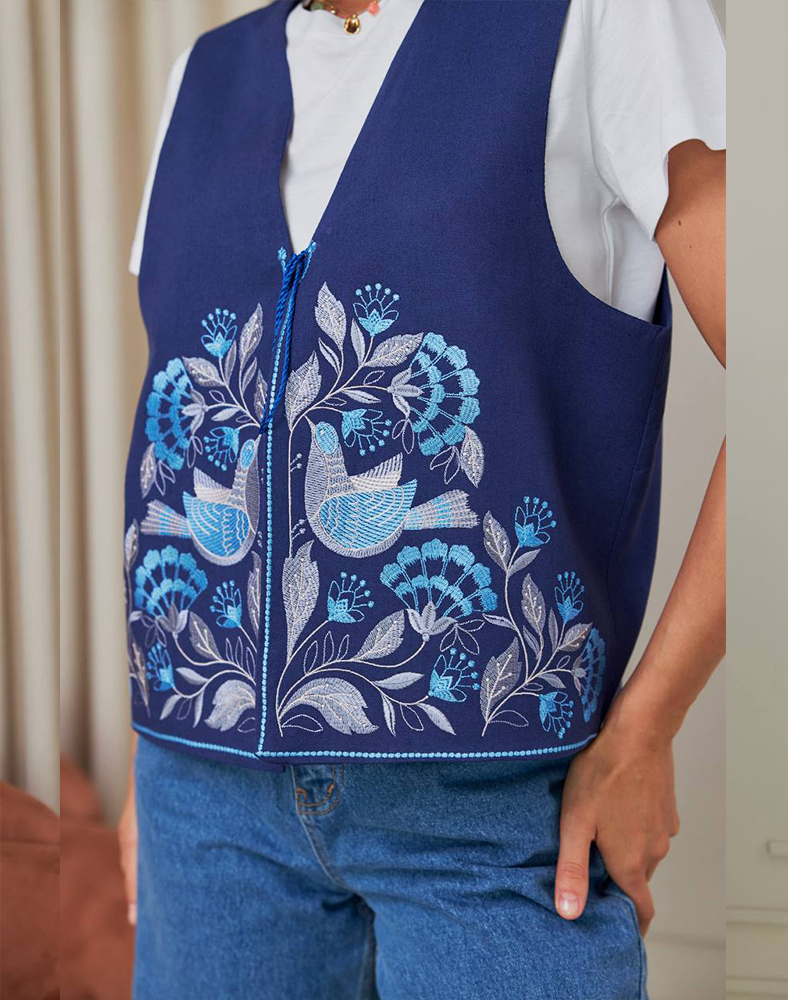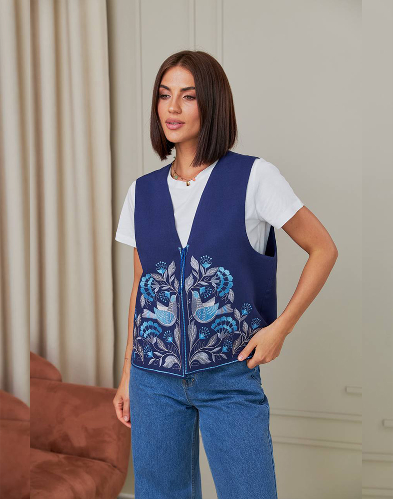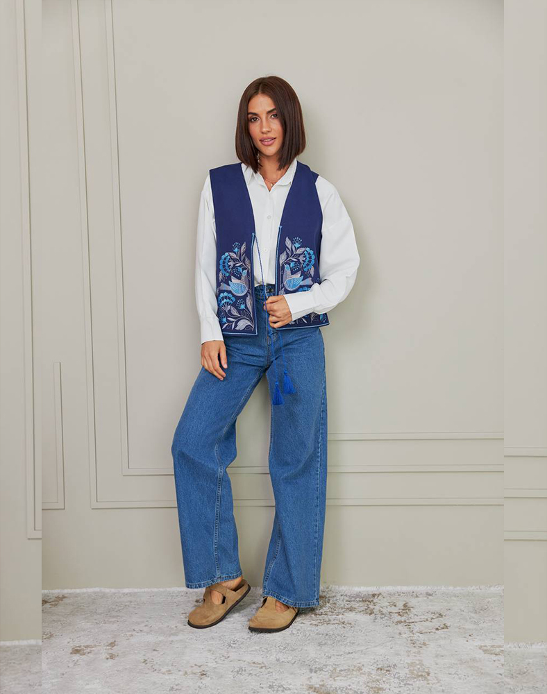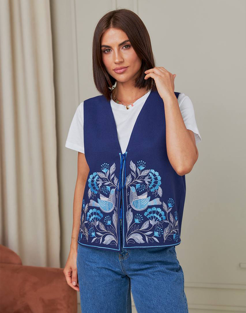 Двухсторонний жилет с новой вышивкой станет стильным акцентом в вашем гардеробе. Нежные оттенки нитей и изысканный дизайн символизируют гармонию, легкость, любовь, свободу, благополучие и мир, которого мы все так ждем . Благодаря универсальному крою он подходит к любому образу - от повседневного до праздничного.